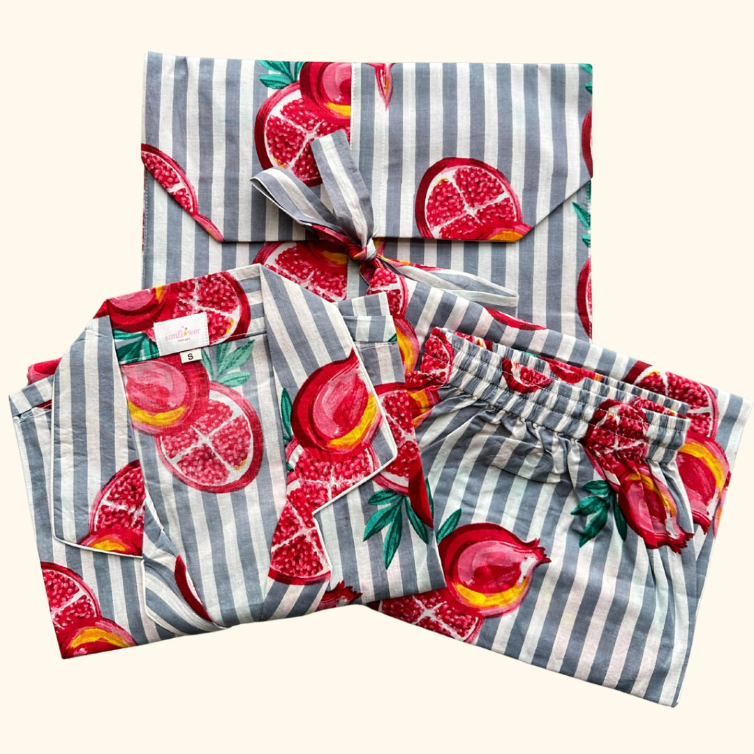 Indulge in luxurious sleep with our Women’s Grey Stripe Pomegranate Half Sleeve Pyjama Set. Made with 100% soft and breathable cotton, these pyjamas provide all-night comfort. The pants feature an elastic waistband for a perfect fit. Machine washable, made in India. Treat yourself to a good night's rest.